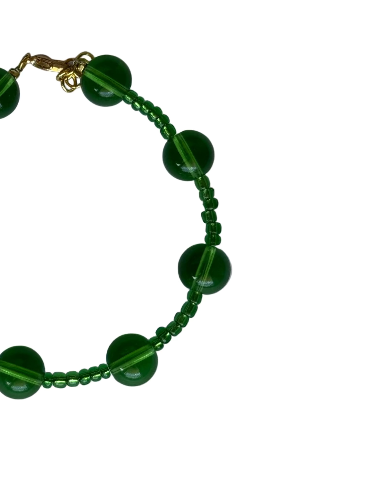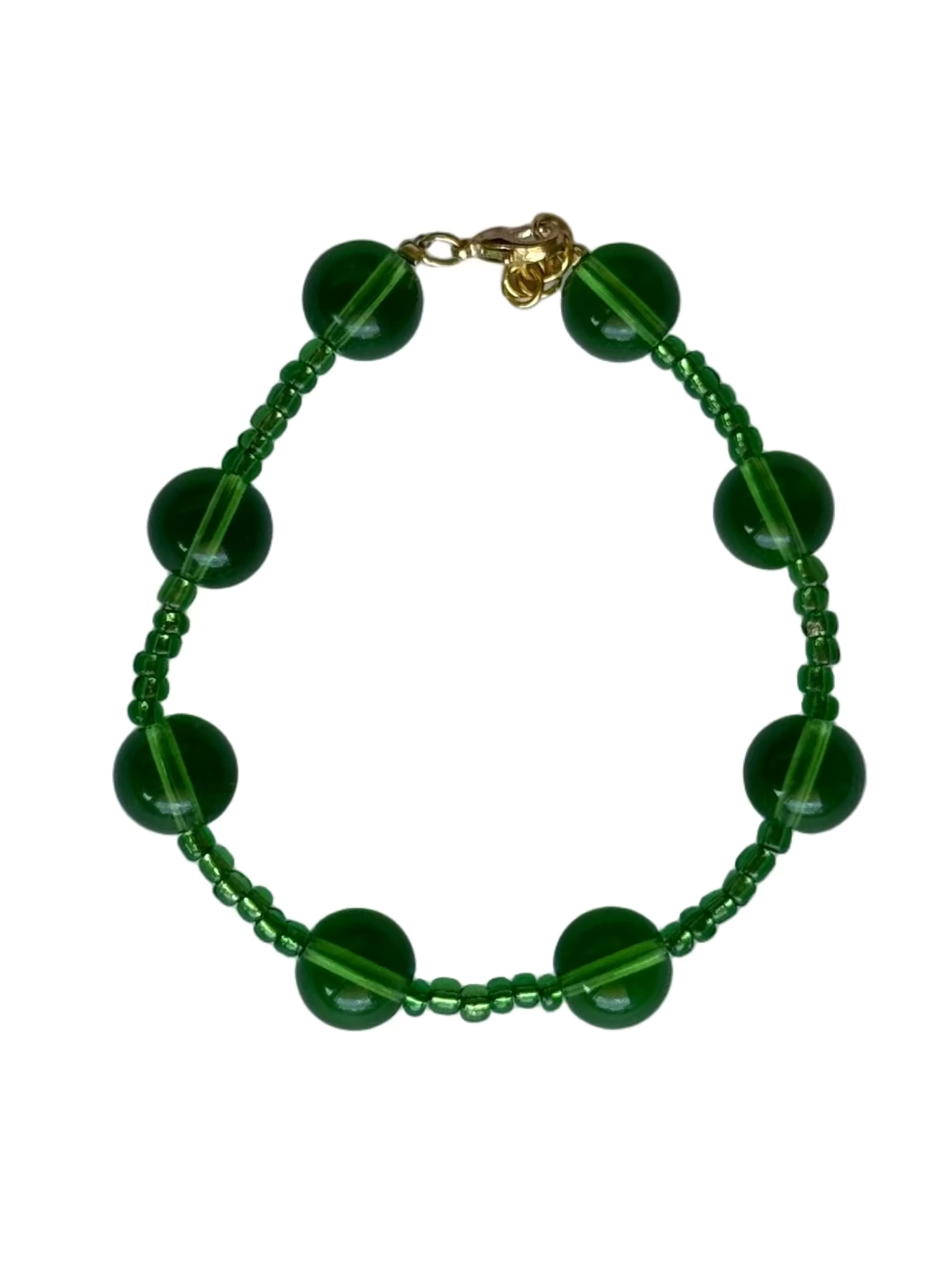 The Verdé Bracelet features smooth green glass beads for a fresh, minimal look. It’s simple, lightweight, and easy to wear — designed to bring a calm, natural tone to your everyday stack.