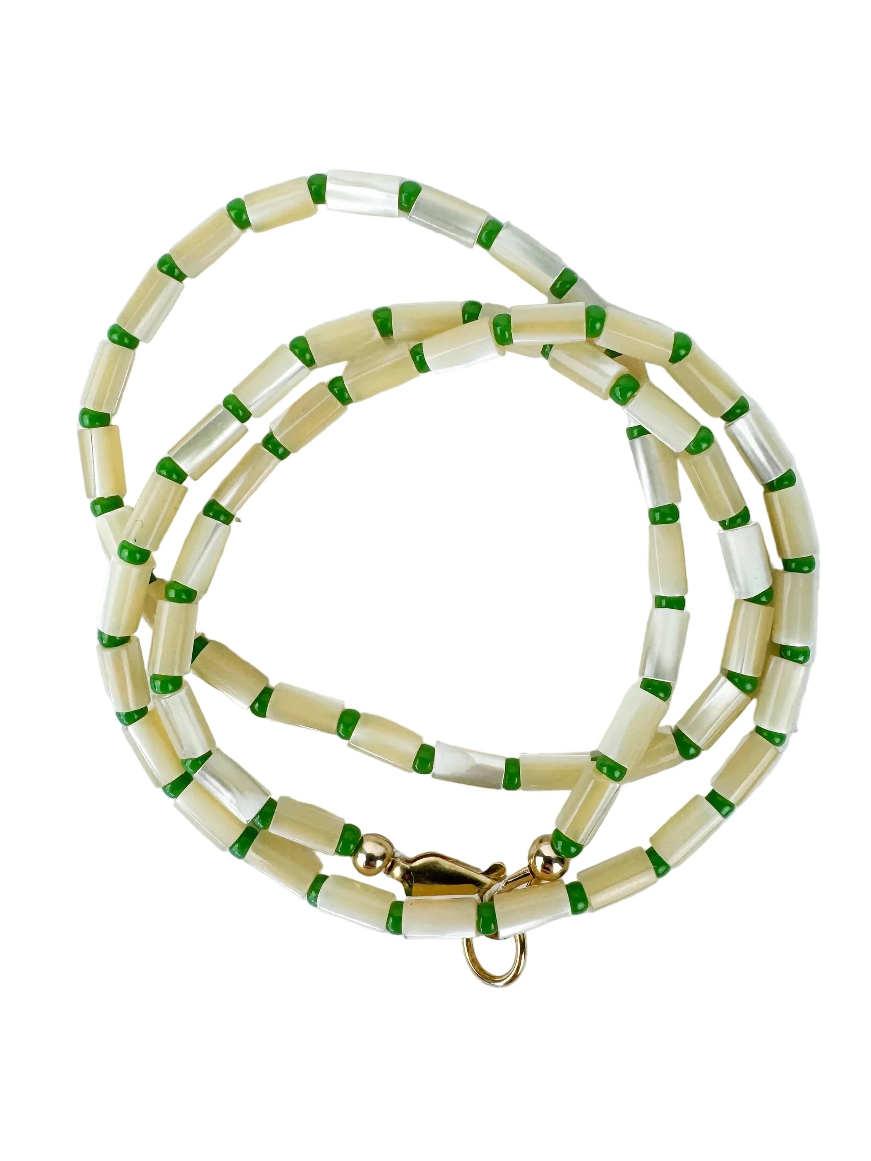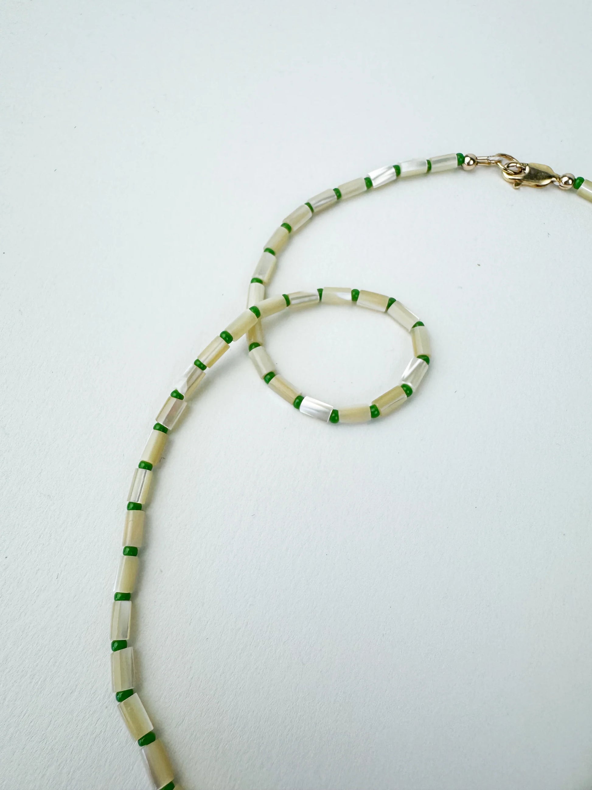 • Natural shell tube beads + green glass spacer beads
