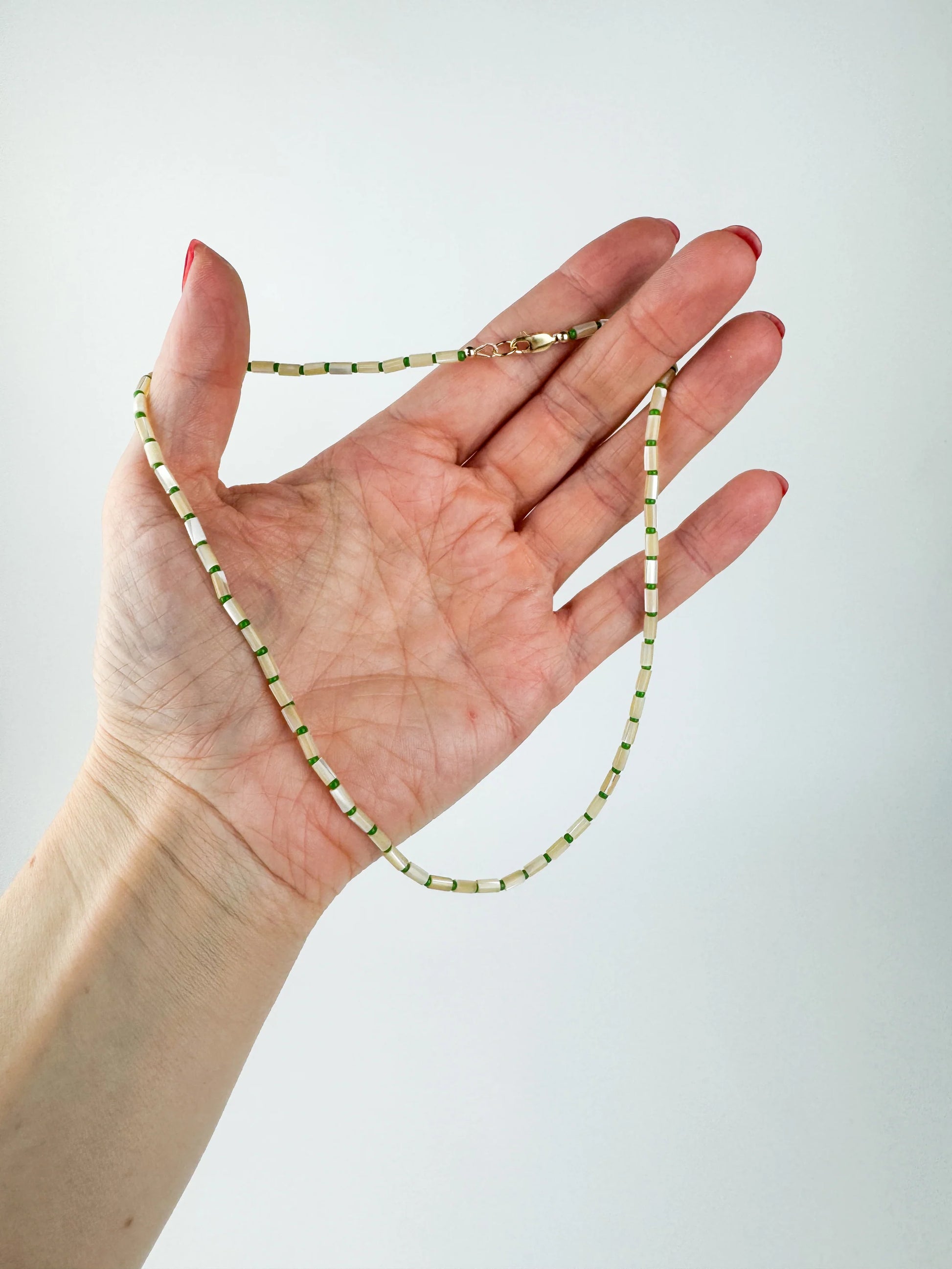 The Nira Necklace is soft serenity with a hint of edge. Natural shell tube beads pair with green accents, creating a subtle contrast that feels fresh, balanced, and effortlessly refined. Inspired by tidal pools and morning light — a quiet statement for everyday wear.