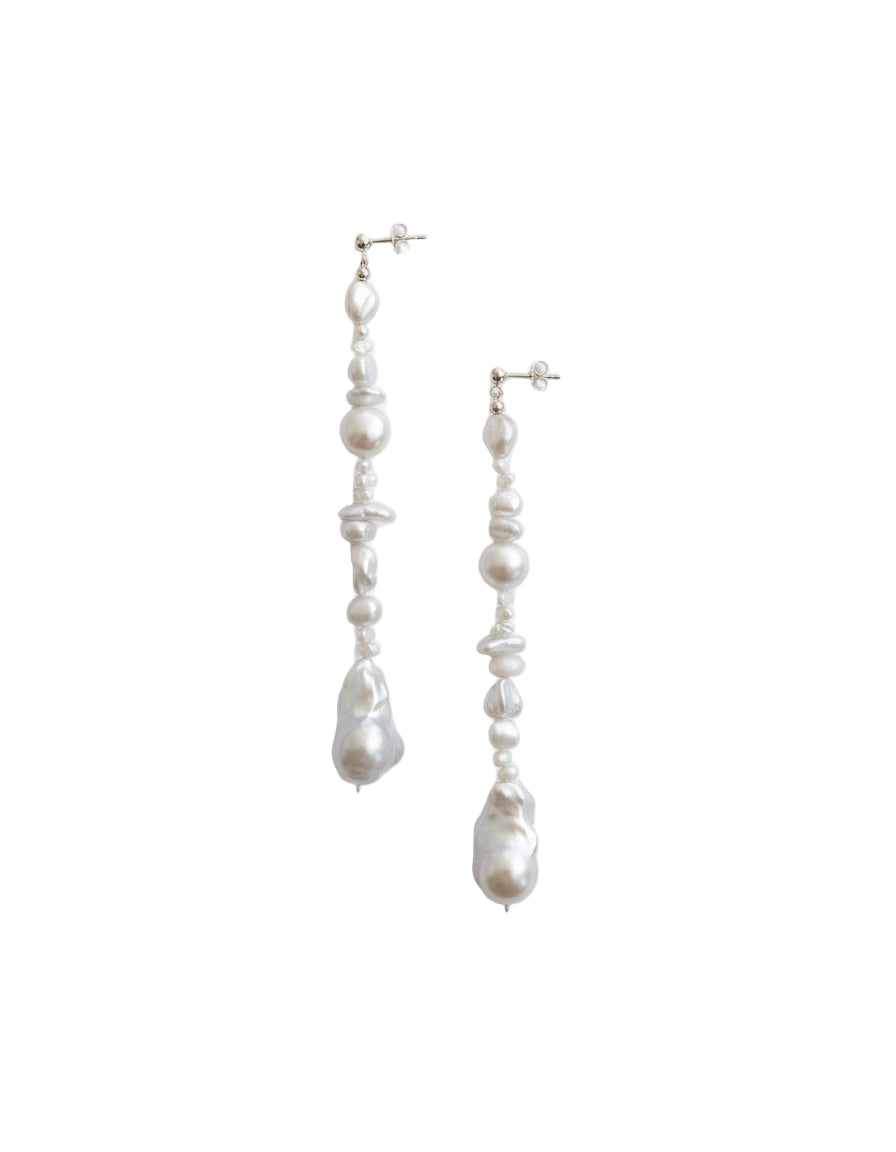 Drift is defined by movement — uneven freshwater pearls stacked with quiet intention. Each earring hangs with a relaxed, sculptural silhouette that catches the light from every angle.