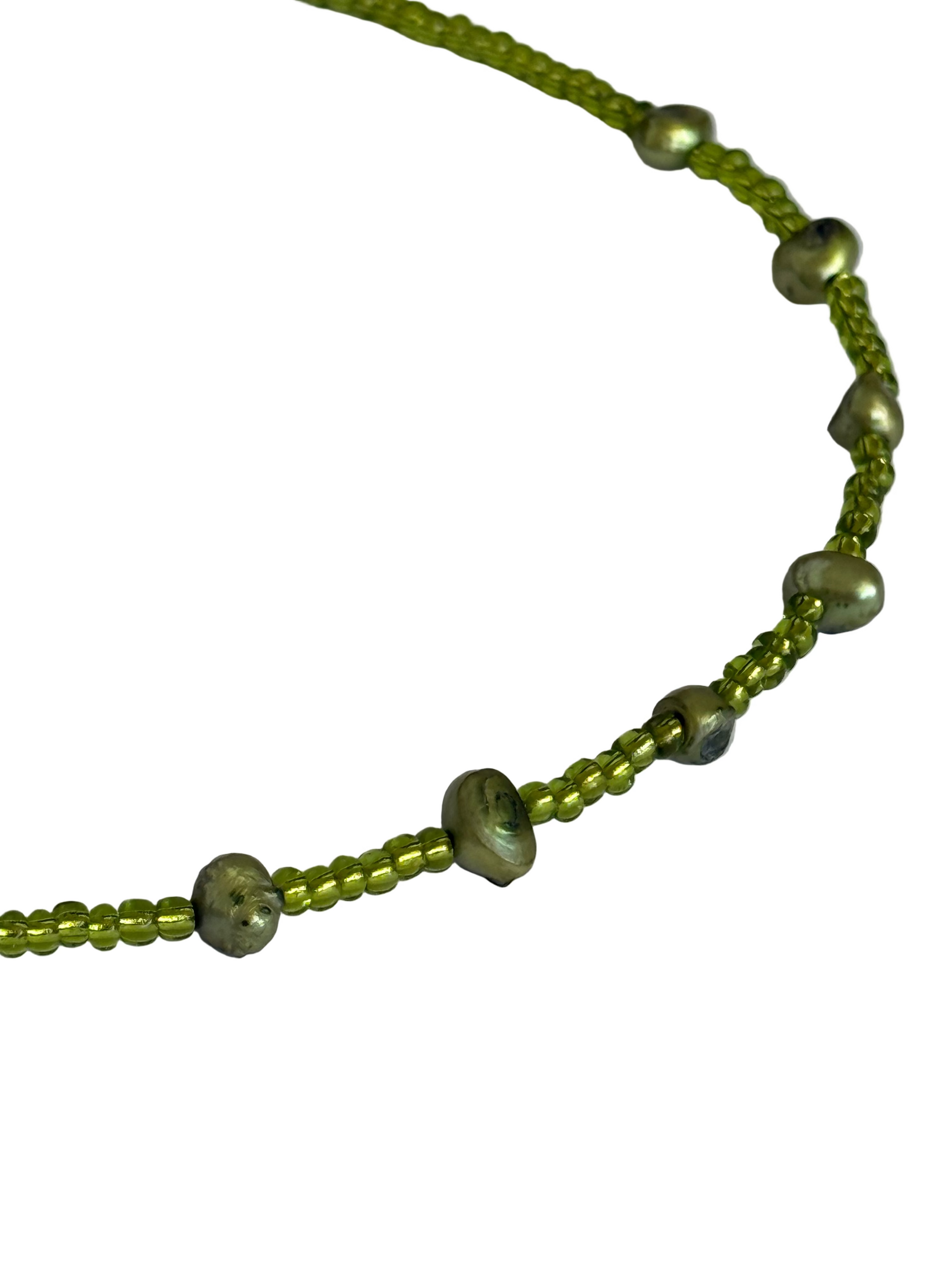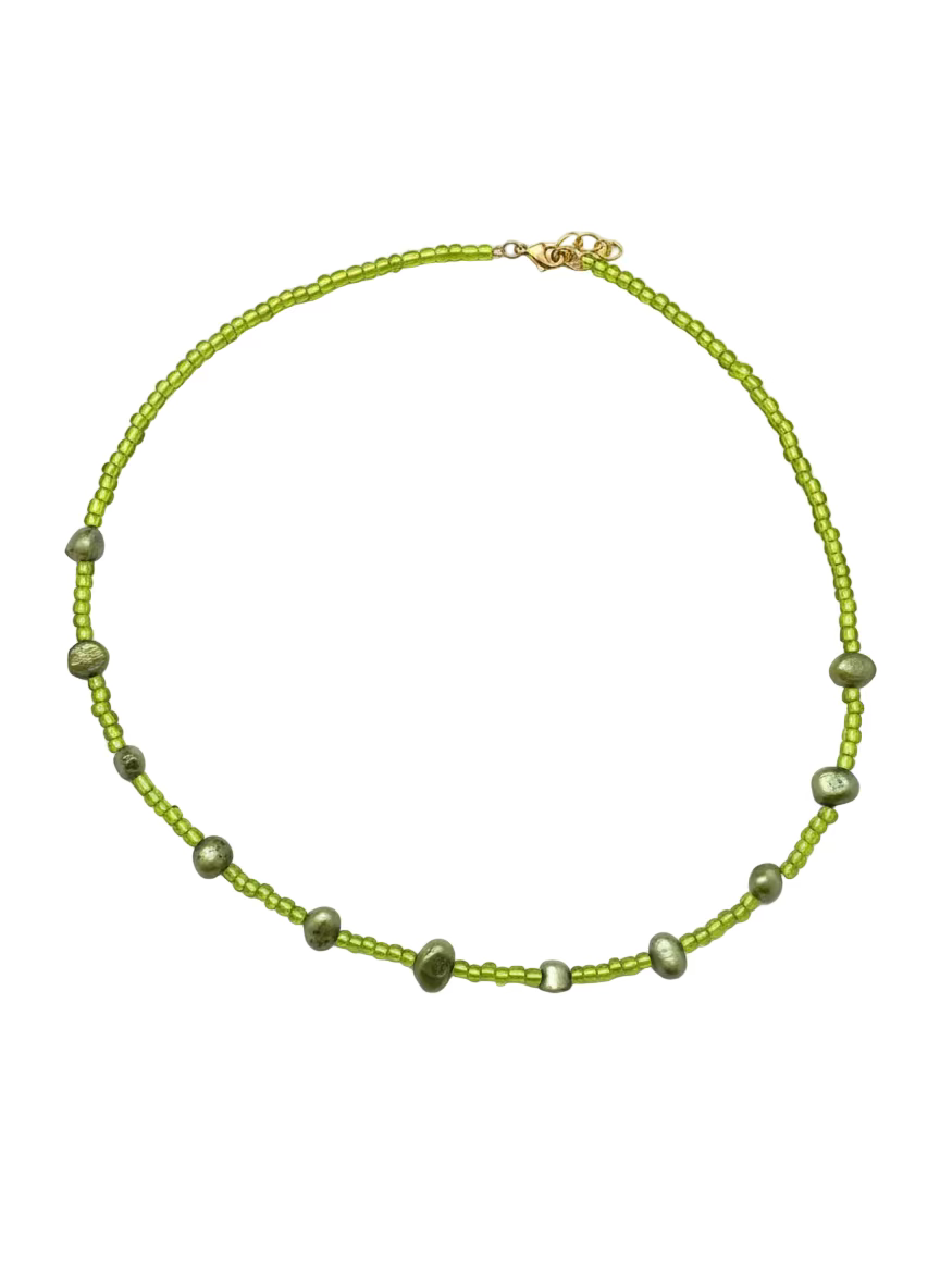 The Liora Necklace brings a modern twist to classic pearls. Soft green tones with natural lustre catch the light beautifully, offering an effortless mix of elegance and edge. Each pearl is unique, creating a one-of-a-kind piece that pairs perfectly with gold or silver layers.