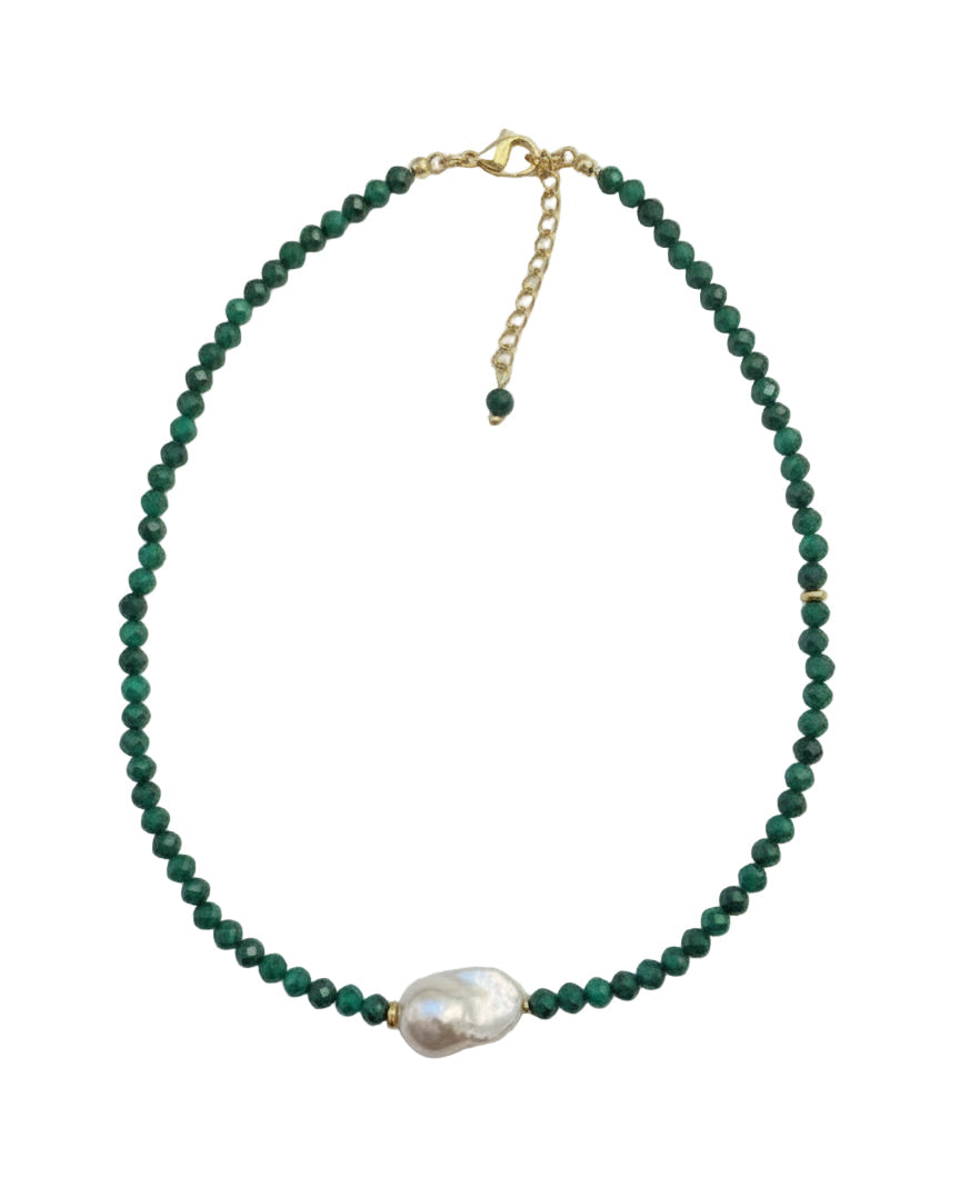 Simple, timeless, and made to last. The Calla Necklace combines faceted natural gemstone beads in rich green tones with a single baroque freshwater pearl, creating a balanced contrast between organic texture and refined elegance.