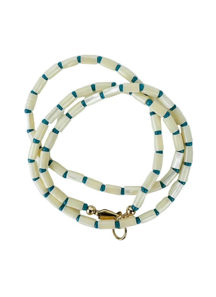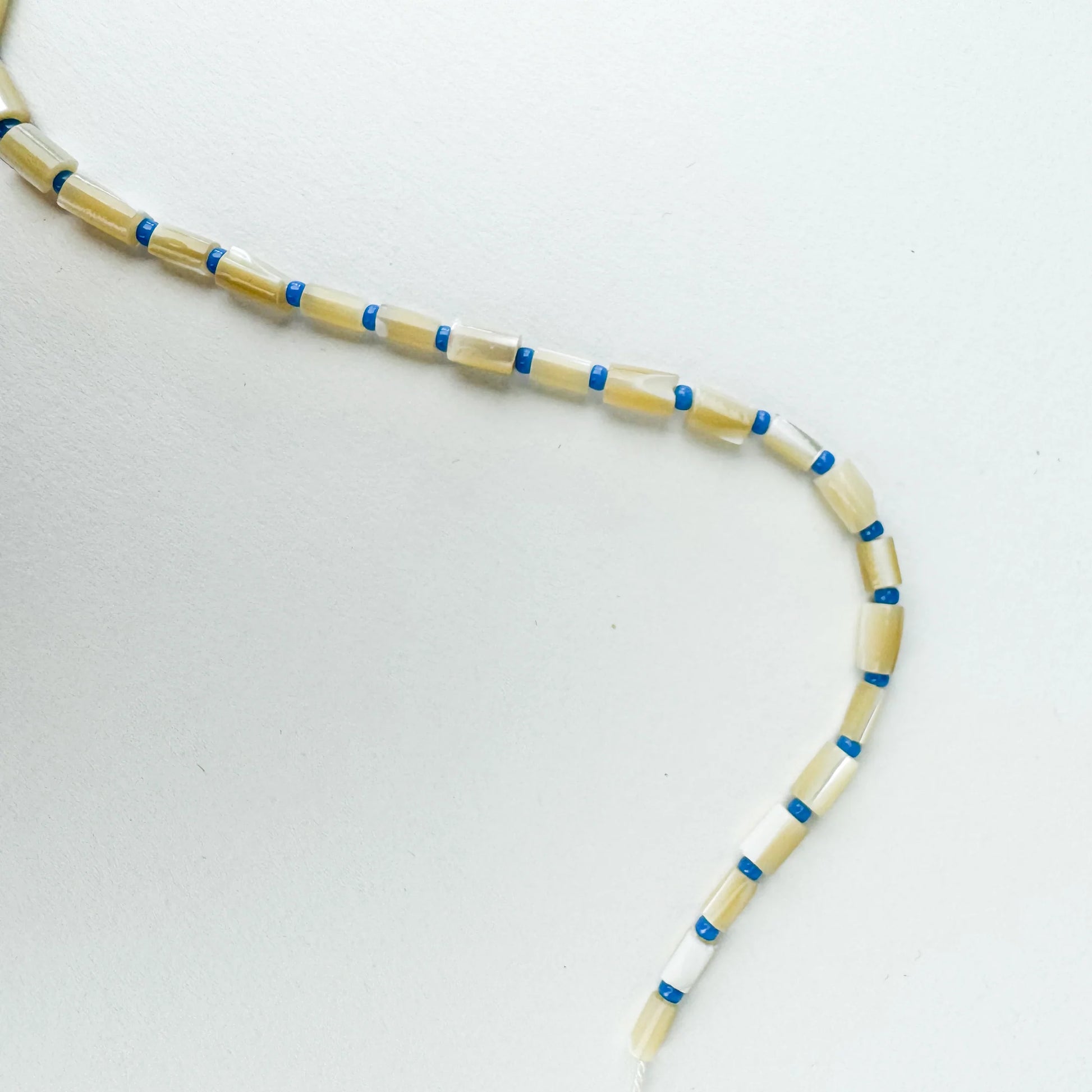 The Isla Necklace captures the essence of sea and sky — natural shell tube beads threaded with vivid blue accents that echo clear waters and calm horizons. She’s fresh, modern, and effortlessly coastal — perfect for layering or wearing solo with a white tee and sun-kissed skin.