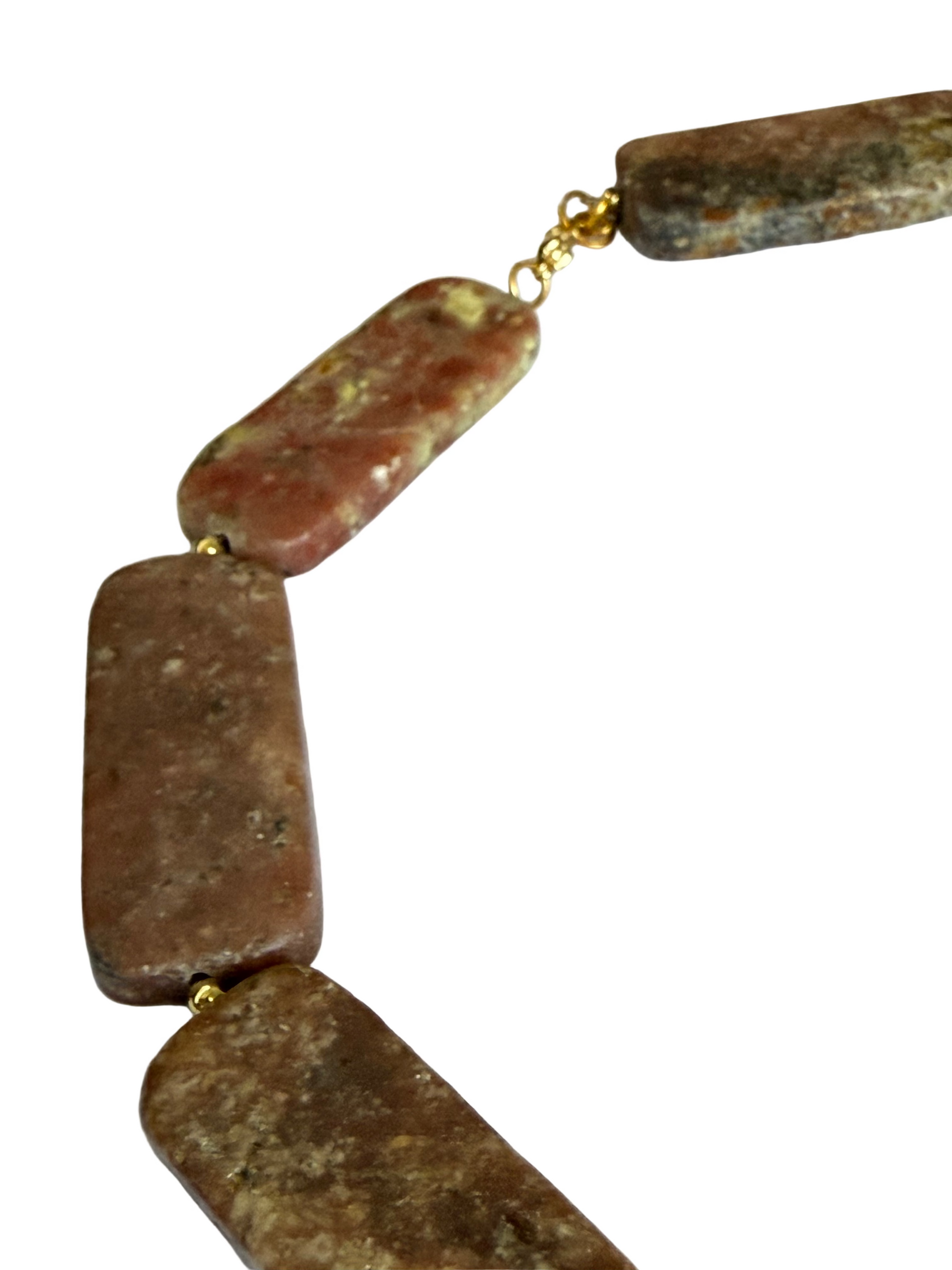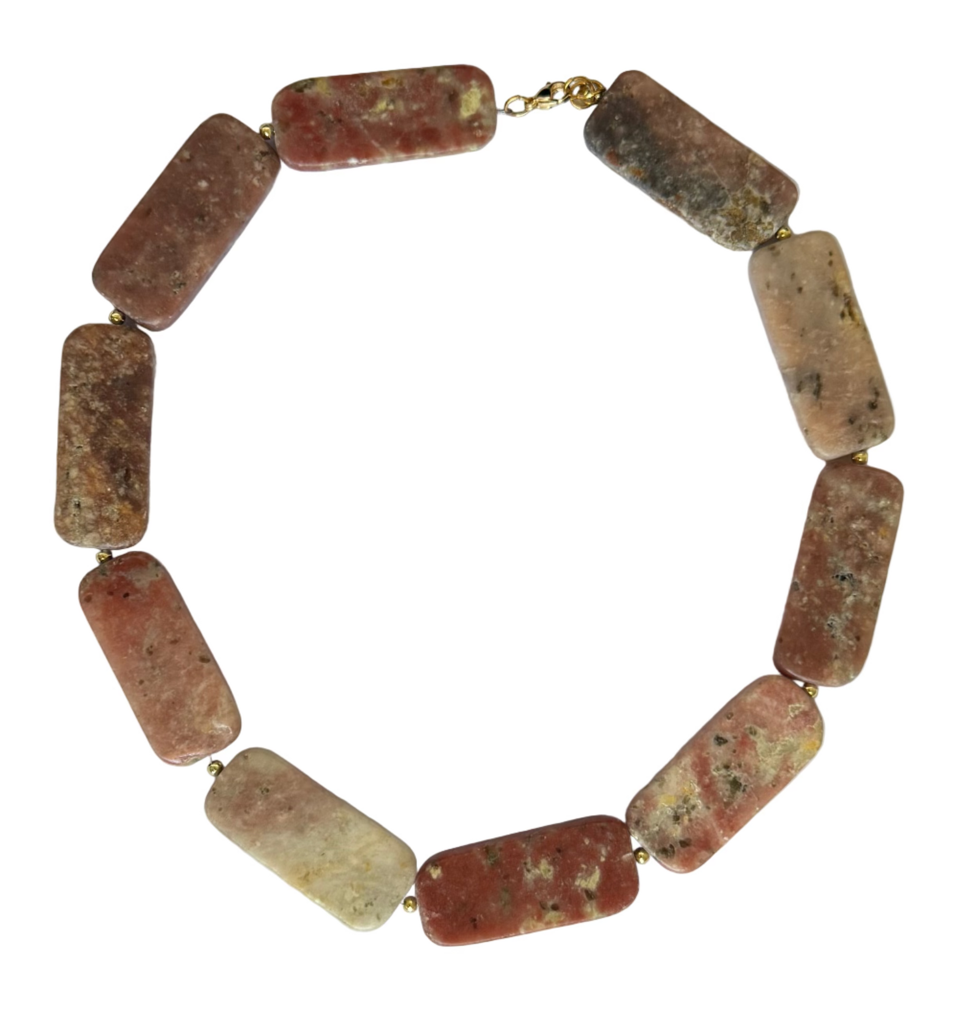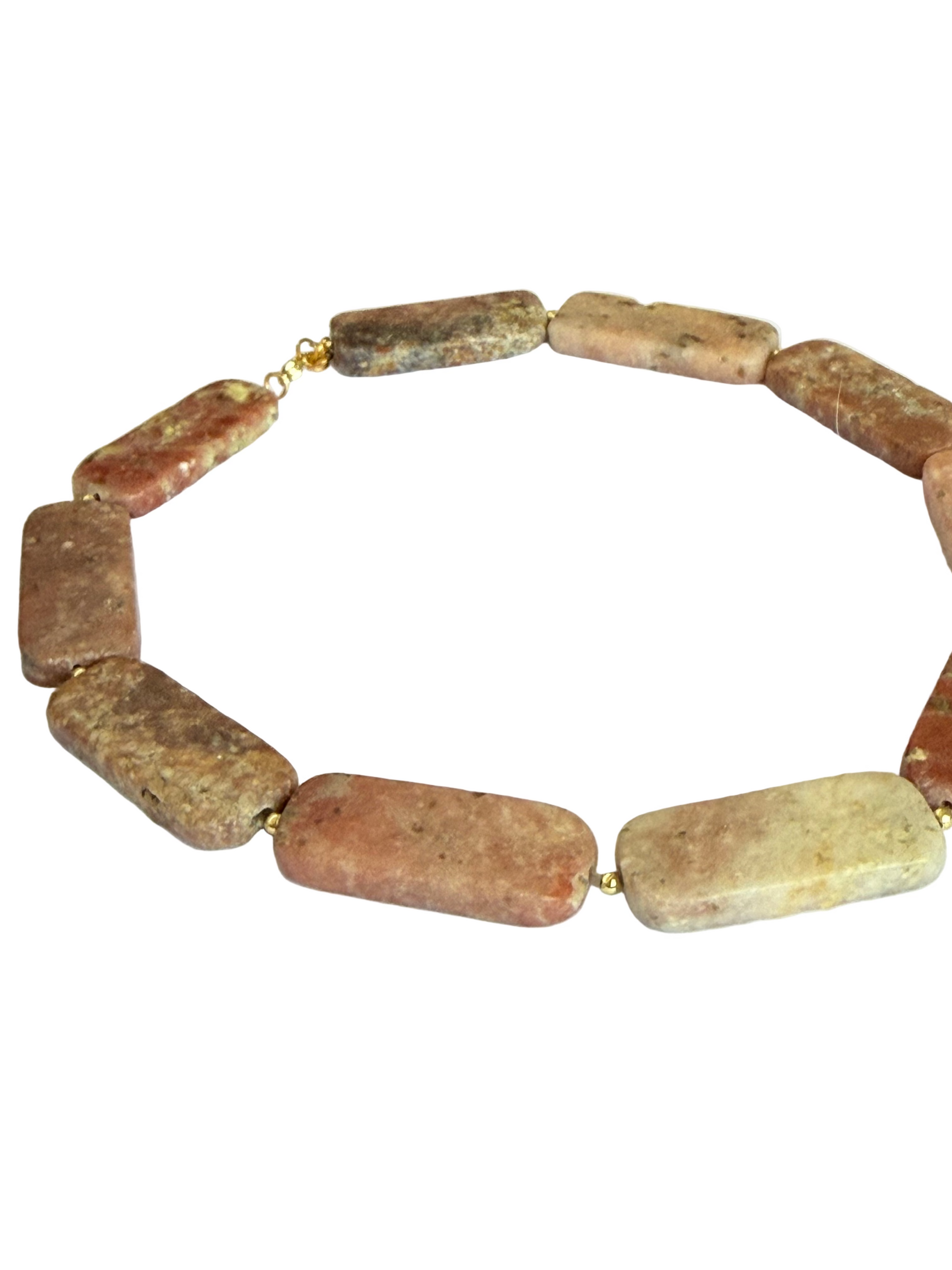 The Rosa Necklace celebrates raw beauty with refined balance. Each piece is made with natural Pink Lepidolite gemstone beads — soft lavender-pink with natural marbling — spaced with smooth gold or silver accents for a polished finish. The rectangular cut gives it an organic, sculptural feel that’s grounding yet effortlessly elegant.