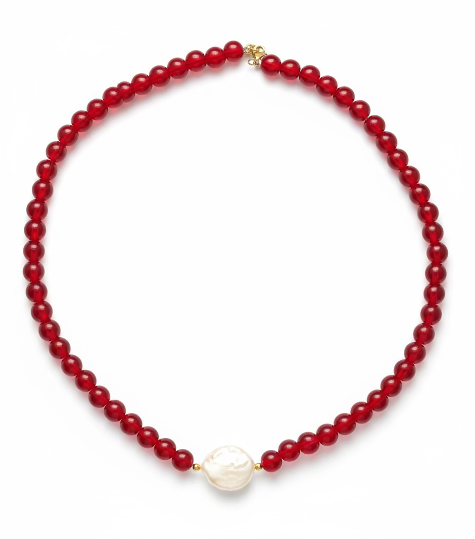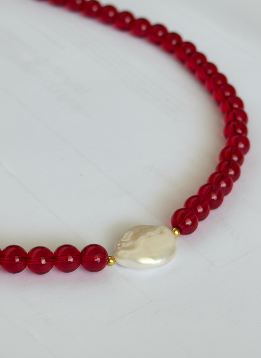 The Roux Necklace adds a refined pop of colour. Made with red glass beads and gold detailing, it’s sleek, minimal, and easy to style — whether you wear it solo or layered.