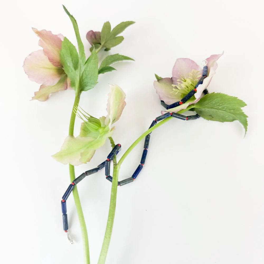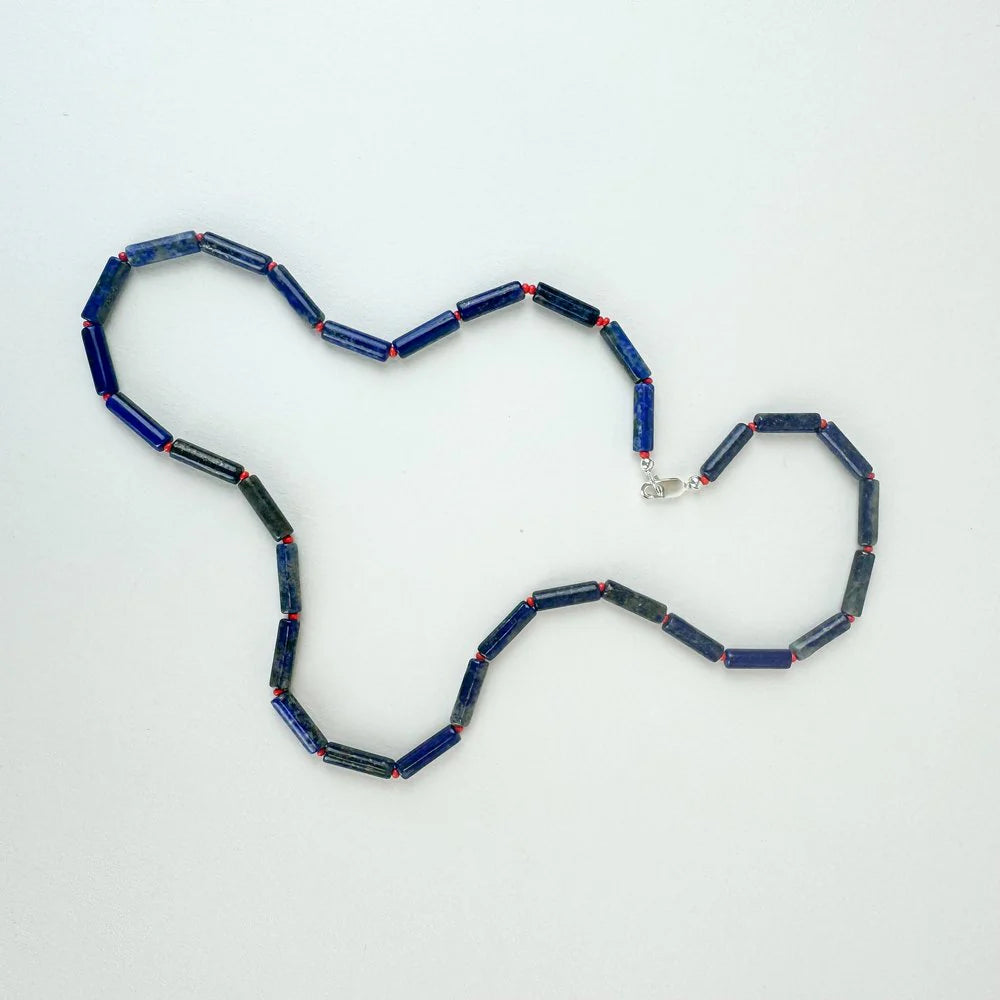 The Arlen Necklace channels quiet strength through contrast — deep blue natural gemstones paired with vivid red spacers that pulse with energy. Grounded, confident, and rich in texture, she’s a modern relic — effortless to wear, impossible to ignore.