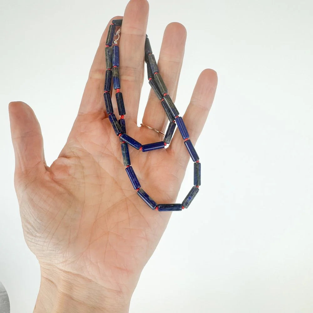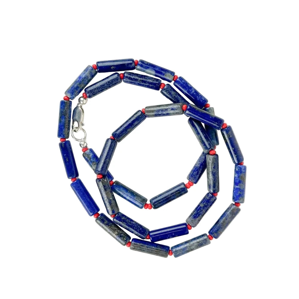 • Natural blue gemstone beads (semi-precious, ethically sourced) + red glass spacers